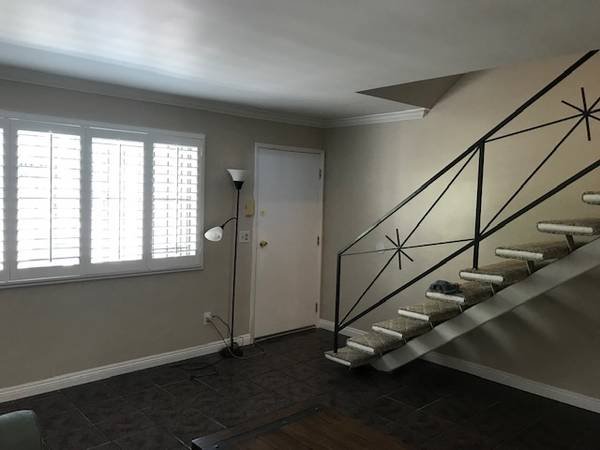 This spacious two-story apartment features two bedrooms and one and a half bathrooms. It comes with two reserved parking spaces and an on-site coin-operated laundry facility. The complex is gated for added security. The bedrooms are situated on the upper level, while the downstairs area comprises a large living room, a dining room, and a kitchen. The unit includes a stove and a refrigerator.