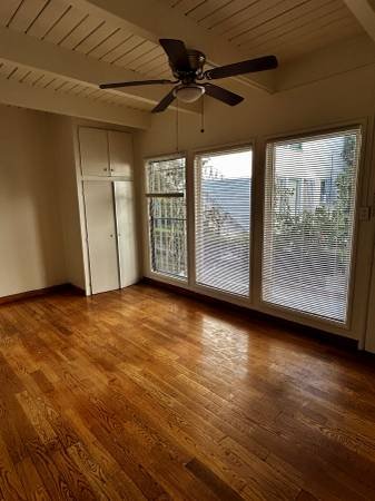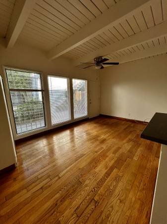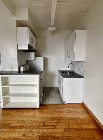 The apartment features beautiful exposed ceiling beams and wood flooring throughout. Large windows allow for ample natural light.