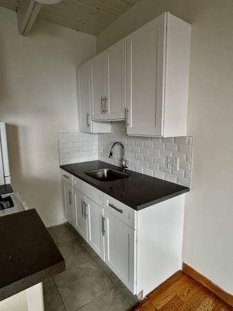 The kitchen is a highlight, having been recently renovated. It boasts beautiful quartz countertops, brand-new cabinetry providing plenty of storage, and includes a functional refrigerator and stove.