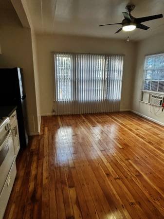 A key feature is its completely private, dedicated entrance. The unit itself is a spacious studio with authentic hardwood flooring and large windows that fill the space with abundant natural light. Climate control is provided by a powerful window air conditioning unit.