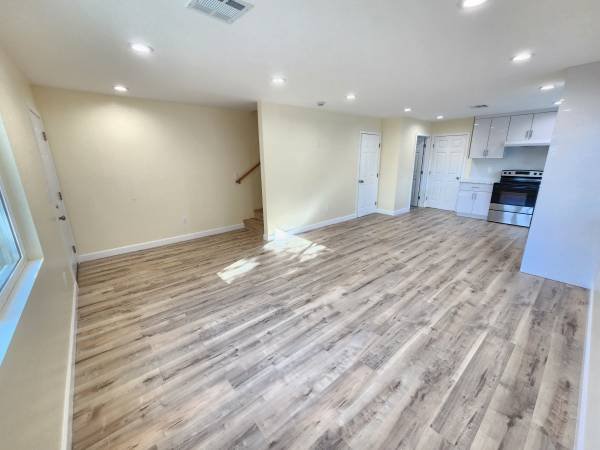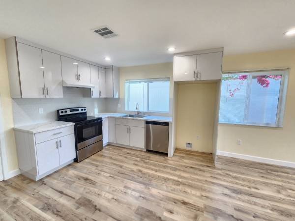 This newly constructed accessory dwelling unit features three bedrooms and two bathrooms. The interior spans 1,200 square feet. The residence boasts fresh paint, recessed lighting, spacious bedrooms, laminate flooring, stainless steel kitchen appliances, and quartz countertops. An in-unit laundry area is provided. The property includes a generously sized patio and a fenced side yard. All utilities are included with the exception of electricity.