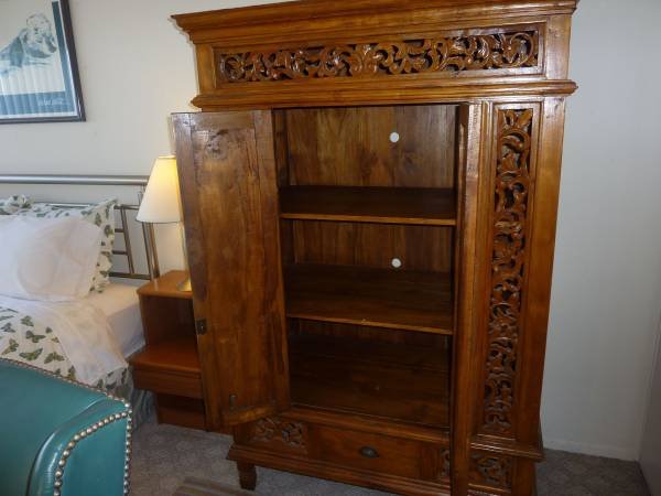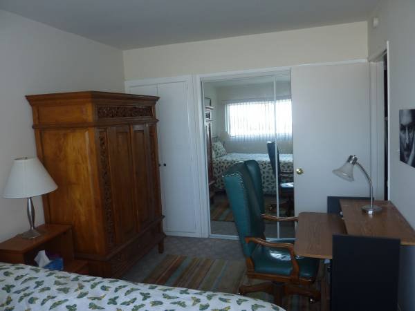 I am open to the possibility of two friends sharing the room for a slightly higher rent of $1500 per month. Please note this arrangement is for platonic friends only; couples are not considered. The room itself is quite pleasant, featuring a high-quality queen-size bed, a large teak armoire, a wall-length closet for storage, plus a desk, chair, and lamp. Photographs are provided above. I have a particular interest in other cultures and give preference to visitors from abroad, though all applicants are welcome. I provide all essentials, including clean, high-quality organic cotton bed linens and bath towels.