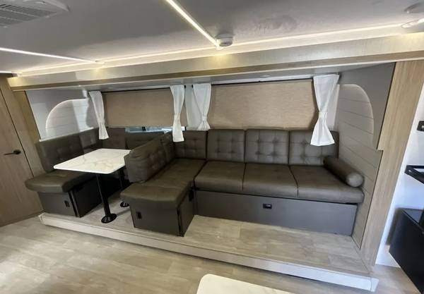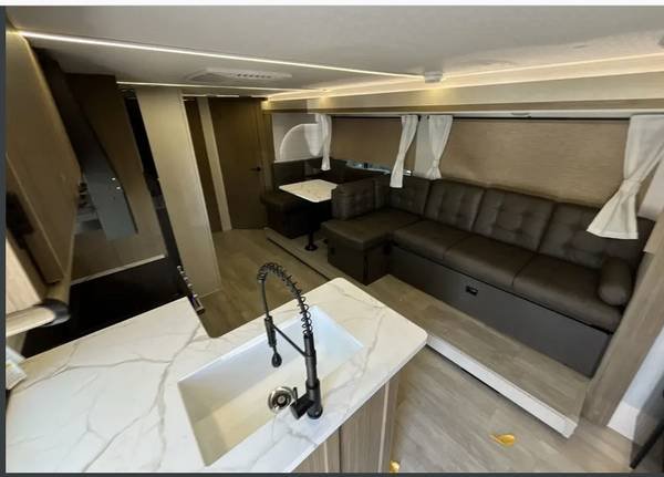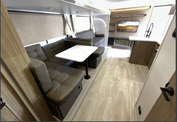 An additional two guests (for a maximum of eight total) can be hosted using the sleeper sofa in the living area. The unit includes a full kitchen and bathroom. This brand-new trailer will be in pristine condition for its first guests.