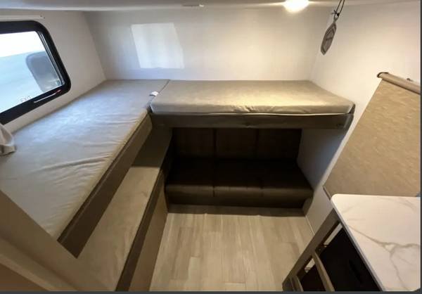 Beautiful large two-bedroom bunkhouse trailer, ideal for hosting your extended family. It comfortably accommodates up to six individuals across two spacious private bedrooms, each featuring a door for privacy.