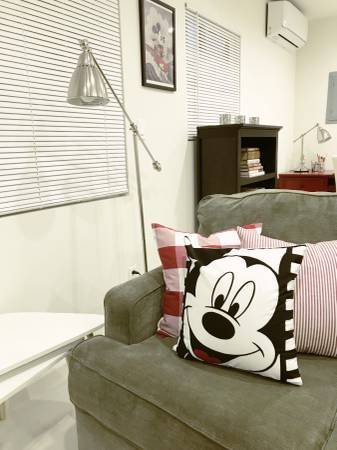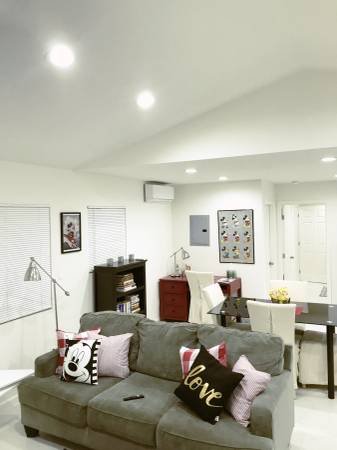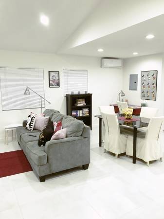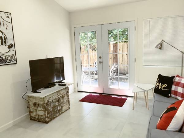 Newly constructed residence featuring an open-concept living area. The living space includes French doors that provide access to a secluded backyard. This property boasts high ceilings, designer flooring, an abundance of windows, and a contemporary kitchen equipped for serious cooking, complete with quartz countertops and stainless-steel appliances. It is offered fully furnished, including a large smart television, along with high-speed internet and WiFi connectivity. The 900 square foot layout is offered at a competitive rate to ensure great value.