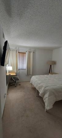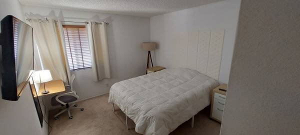 Fully furnished 11x11 carpeted room with big closet, 40 inch smart TV, WiF and hard wired internet, queen sized comfy bed in a nice condo area. Full bathroom with a double vanity. There\'s a patio to hangout at, and pool with hot tub. You will have full access the living area and kitchen and the garage.
