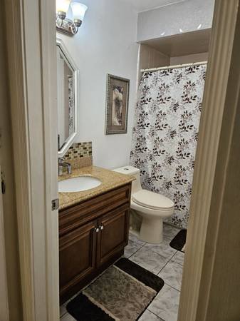 I reside in a lovely two-bedroom, two-bathroom condo located in a quiet area of a large apartment complex. The unit features a small, private, fenced backyard—a unique amenity among tenants. You will have your own bedroom with a private bathroom and a separate entrance. I have one small dog, so no additional pets are permitted.
