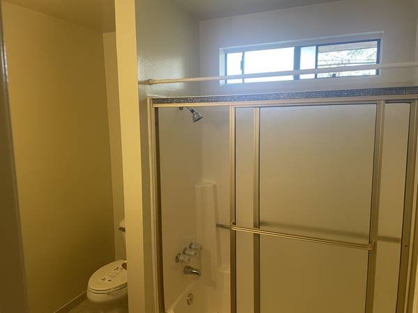 The bedroom itself is a private space. Common areas of the home include a shared kitchen, living room, and a compact rear patio. An in-unit washer and dryer are provided for tenant use. Street parking is typically readily available.