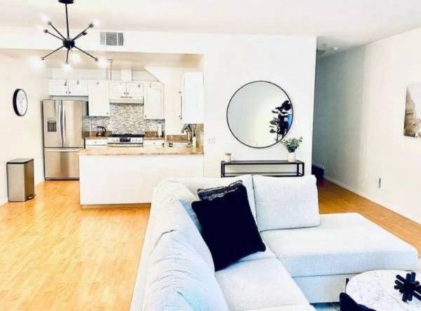 Step inside to a welcoming and luminous living area, adorned with elegant hardwood flooring, nine-foot ceilings, and a sizable 65-inch flat-panel television. The adjoining kitchen, designed with an open layout, is equipped with modern stainless steel appliances and all the essentials for preparing gourmet meals. Enjoy gatherings around the sophisticated dining set.