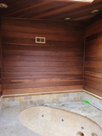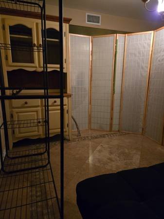 This is a fully furnished, private first-floor area in a gated townhouse located in Valencia, within Santa Clarita. The space is separated by a screen and includes a futon sofa and a dresser. It features travertine flooring and shares access to an upstairs hallway bathroom, which has a skylight and a jacuzzi tub. The rental is offered on a fixed one-month term, with the possibility of renewal upon mutual agreement. The monthly rate is $625, with a $100 deposit, and all utilities are included. The accommodation is suitable for one individual. Cooking is limited to the use of a microwave and toaster oven.