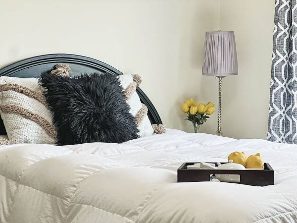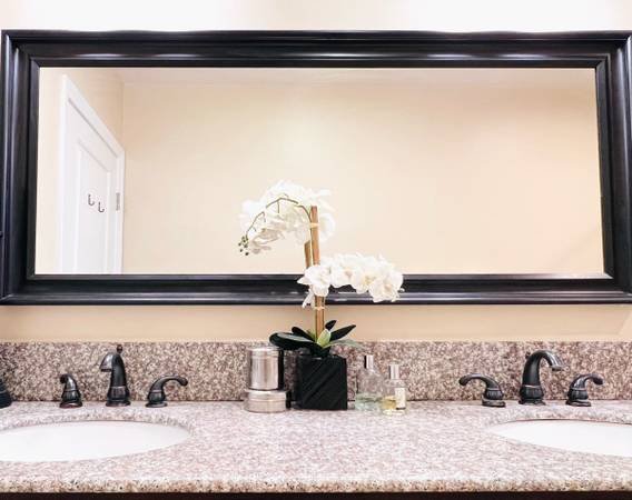 A separate, shared bathroom is equipped with dual sinks. I value peaceful and tidy individuals. As an artist, writer, and performer, I frequently work from my studio or on set. This home is a sanctuary, a place for rest and rejuvenation. Tenants must be employed at least part-time outside the home.